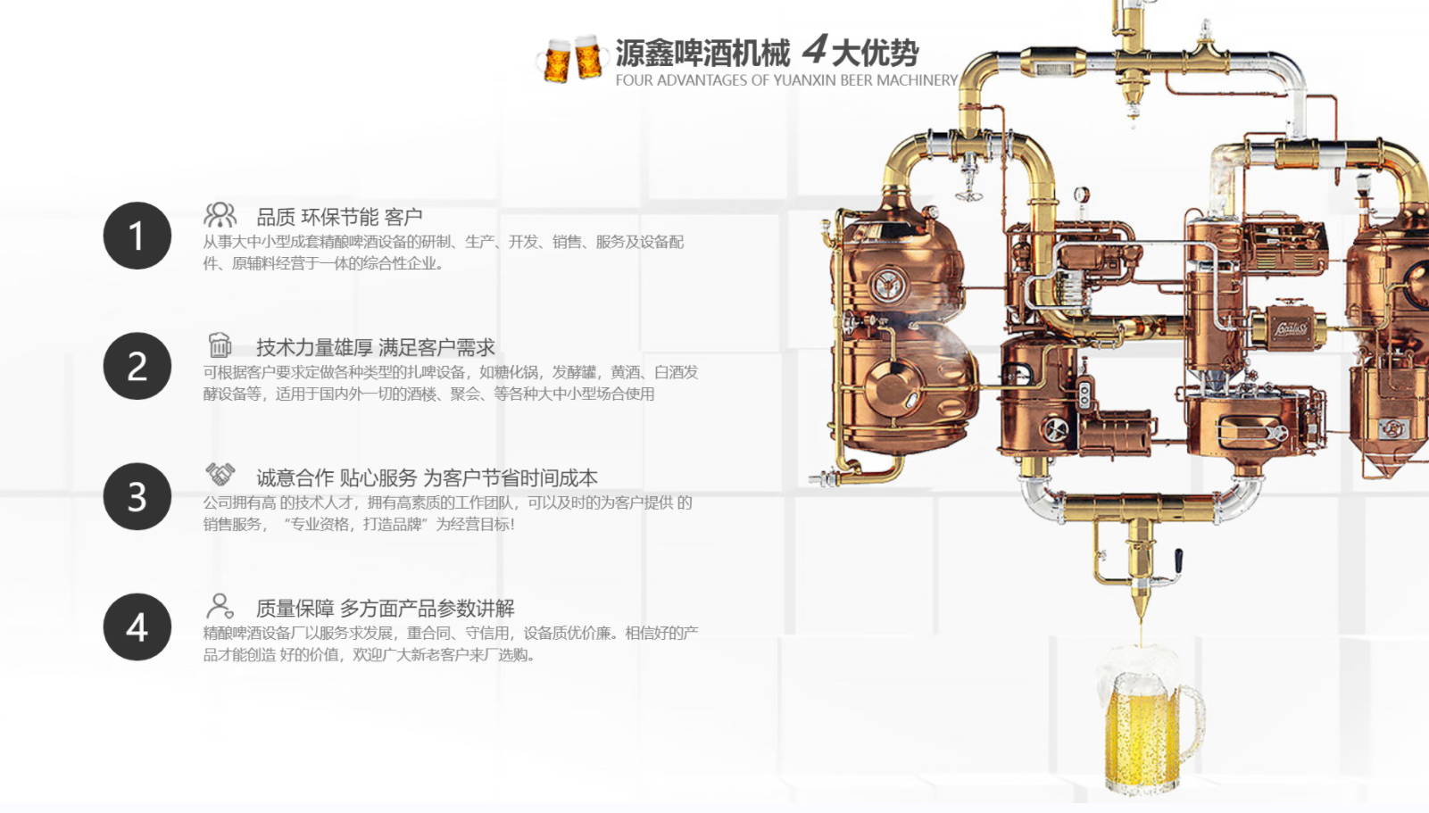 南陽(yáng)市源鑫啤酒機(jī)械設(shè)備有限公司位于歷史文化名城一-南陽(yáng),從事大中小型成套啤酒、白酒自釀設(shè)備的研制、生產(chǎn)、開(kāi)發(fā)、銷(xiāo)售、服務(wù)及設(shè)備配件、原輔料經(jīng)營(yíng)于一體的綜合性企業(yè)。公司可根據(jù)客戶(hù)要求定做各種類(lèi)型的扎啤設(shè)備,如糖化鍋,發(fā)酵罐,黃酒、白酒發(fā)酵設(shè)備等,適用于國(guó)內(nèi)外一切的酒樓、餐廳、家庭.聚會(huì)、酒吧等各種大、中、小型場(chǎng)合使用。公司擁有技術(shù)人才,擁有高素質(zhì)的工作團(tuán)隊(duì),可以及時(shí)的為客戶(hù)提供**的銷(xiāo)售服務(wù)。公司以“專(zhuān)業(yè)資格,打造品牌”為經(jīng)營(yíng)目標(biāo),“卓越質(zhì)量,信賴(lài)價(jià)格”為經(jīng)營(yíng)宗旨,以質(zhì)量求生存,以服務(wù)求發(fā)展,重合同、守信用,設(shè)備質(zhì)優(yōu)價(jià)廉。相信好的產(chǎn)品才能創(chuàng)造 好的價(jià)值,歡迎廣大新老客戶(hù)來(lái)廠(chǎng)選購(gòu)。...